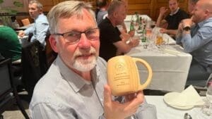 I et langt og usedvanlig aktivt yrkesliv har Odd Borgestrand arbeidet som fagjournalist i vann- og avløpsbransjen, blant annet for SSTT og RIN. Også i år deltok han på og dekket årsmøtet og fagdagene for RIN. Nå trapper han ned arbeidsvirksomheten sin, og overlater stafettpinnen i SSTT og RIN til Inger Anita Merkesdal. Det var under festmiddagen på fagdagene Reidar Kveine holdt en liten takketale og overrakte et symbolsk minne til ham.