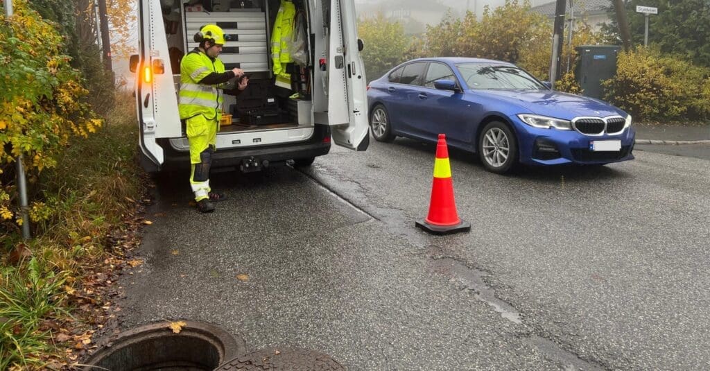 Kummen lekkasjesøker Sander Henry Johnson har åpnet er en felleskum. Kumkartet på iPaden forteller ham at den er fra 1931. Nederst i kummen er en åpen kloakkrenne, over denne er et kryss med vannledninger i tre retninger. Fra det ene strømmer drikkevann. Oppstrøms lyttet Johnson seg frem til lekkasjen ved hjelp av settet med korrelerende mikrofoner, som han nå er i ferd med å pakke tilbake i bilen. Også den er strategisk plassert, for å gi et trygges og mest effektivt arbeidsområde. Likevel står Ole Christian Karlsen på andre siden av veien for å passe på trafikken. Mye av arbeidet de gjør kunne strengt tatt vært utført av en person på jakt etter lekkasjer. Av HMS-grunner arbeider fagfolkene som regel to og to. Det meste av arbeidet deres gjennomføres i vei. Når lekkasjesøkeren konsentrerer seg om å lytte i høretelefonene og stirrer ned i asfalten, er det ikke mulig å samtidig ha kontroll på biltrafikken.
