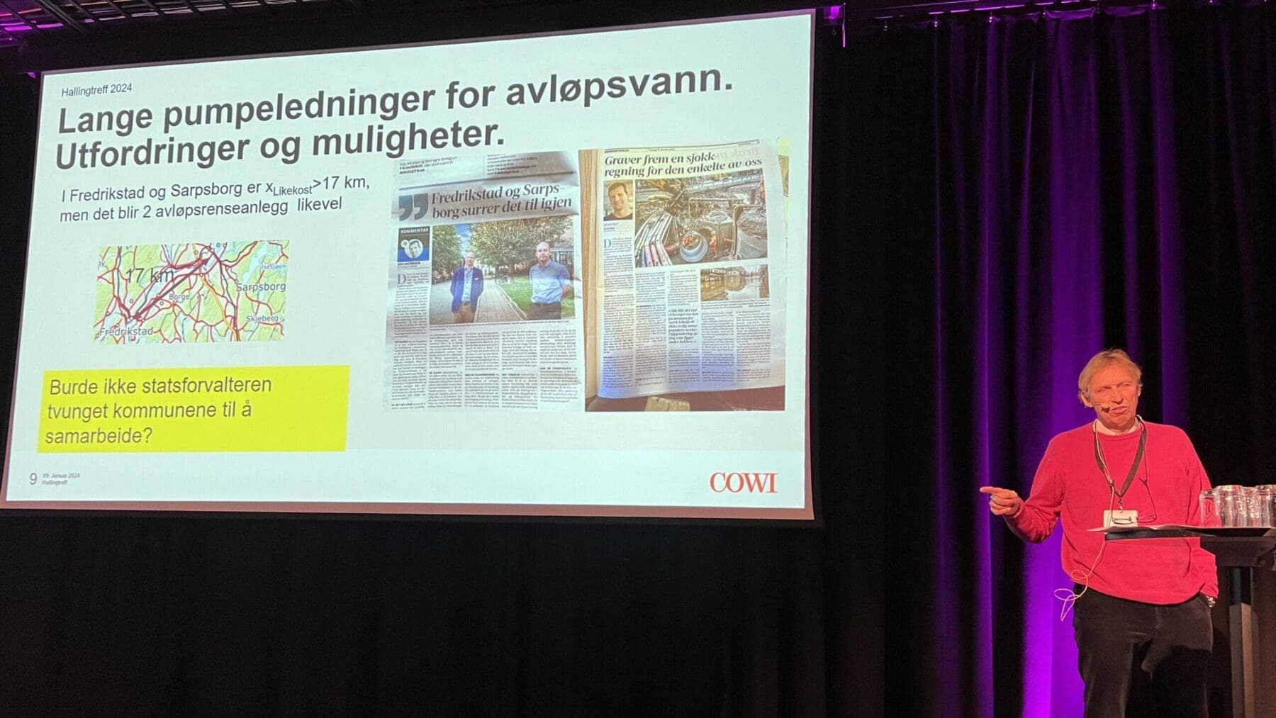Skal kommunene virkelig ha lov til å vedta utbygginger som er unødige og kostnadsdrivende, fordi de ikke lykkes i å bli enige om fellesprosjekt? var blant temaene Tom A. Karlsen var innom i sitt foredrag om lange pumpeledninger.