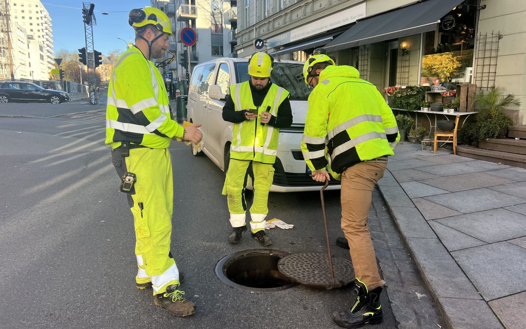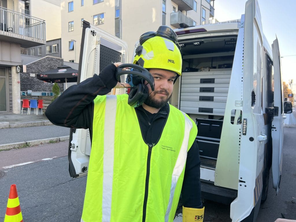 – Vi har algoritmer som gjør at vi får opp punkt som er av interesse. Men når lekkasjer ikke er mellom to loggere, kan ikke loggerne finne de. I dette tilfellet var det mye lyd utenfor en logger. Da må vi lytte utenfor plasseringen til loggerne, og søke oss frem til punktet der lyden er høyest. I stille sidegater er det mulig å lytte på dagtid, andre ganger må vi lytte om natten, beskriver erfarne Sander.