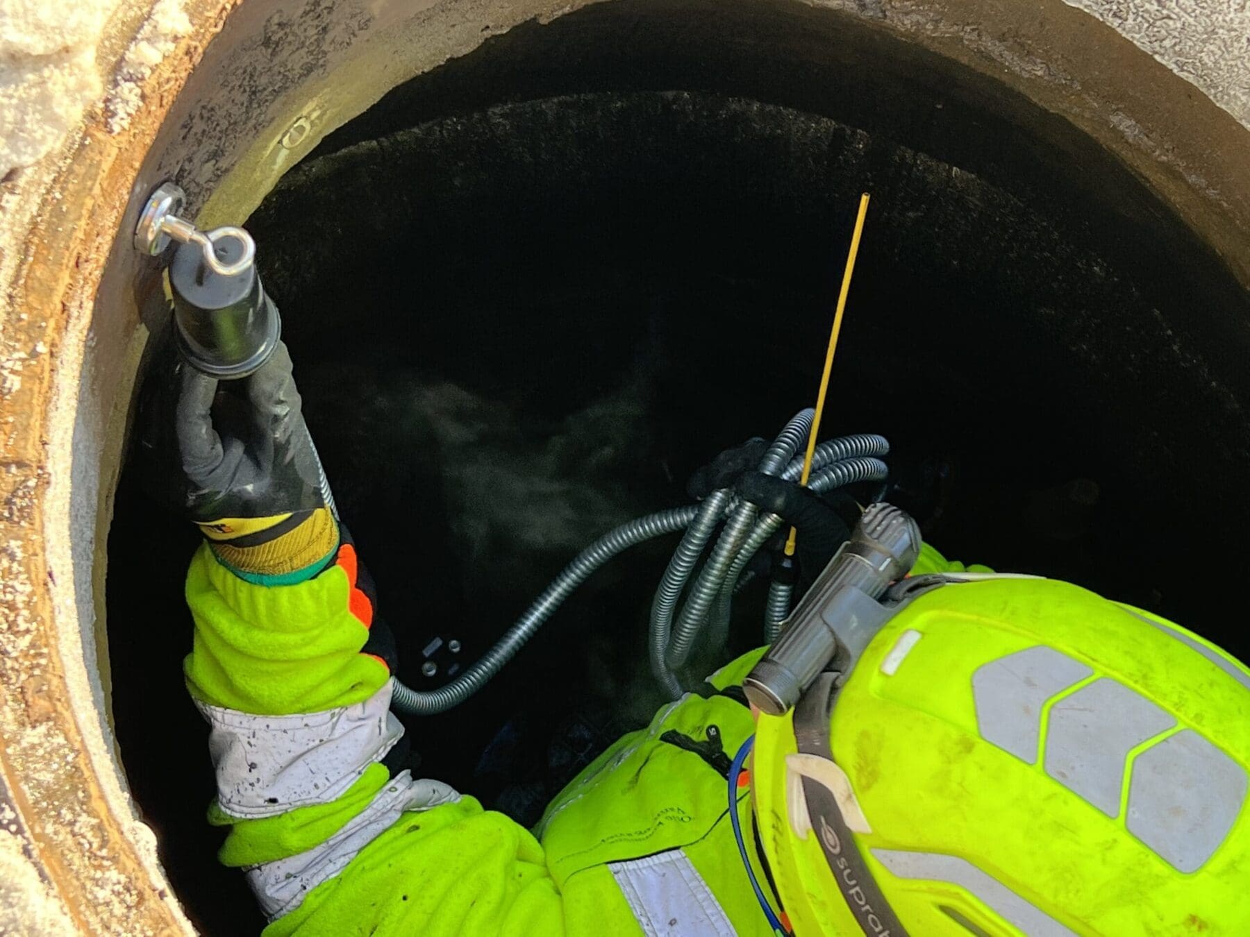 Fra v. Sander Henry Johnson som henter ut verktøy, mens Kenneth Skullerud følger med på arbeidet i kummen. Begge fra gruppen Funksjon lekkasjesøk i VAV.