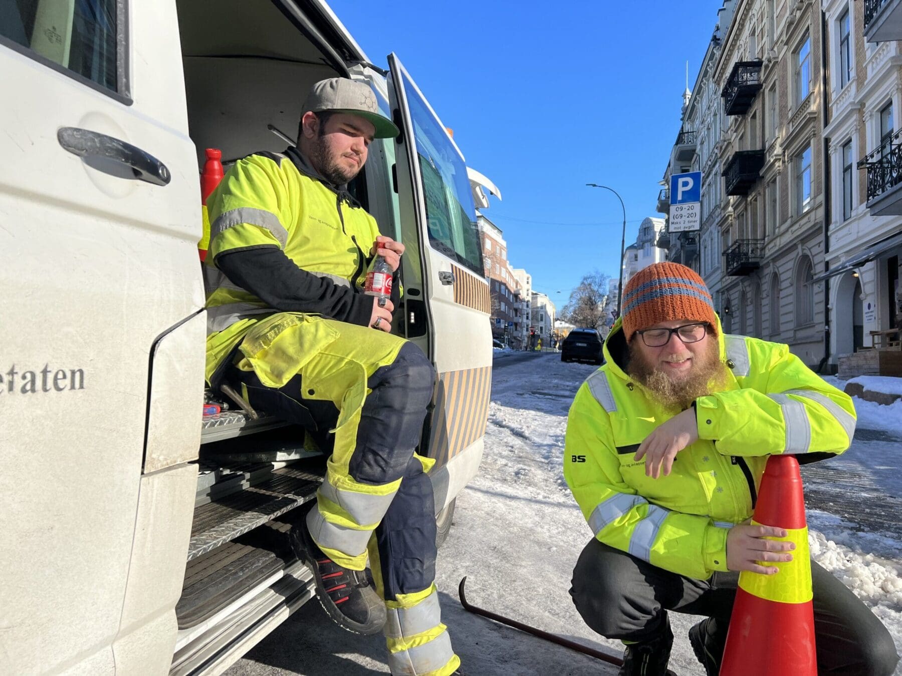 Vi er kommet frem til krysset hvor brannvannskummen ligger. Det er fortsatt frost i sentrum, men kummen er heldigvis lett tilgjengelig. Sander Henry Johnson vipper erfarent av kumlokket. Han er opprinnelig rørlegger. Som lekkasjejeger får han brukt både rør-kompetansen sin og massiv erfaringer fra data og gaming på fritiden. Tredjemann der i veikrysset er Tobias Reierstad Svarem, fra Funksjon mekanikere i VAV. Lekkasjesøkernes kunnskap er knyttet til å finne lekkasjer. Nå har gruppen Funksjon lekkasjesøk fått med seg to mekanikere fra Funksjon mekanikere. Planen er å samarbeide nå i starten, og at teknikerne etter hvert skal overta alt arbeidet med å montere mikrofonene. Da kan lekkasjesøkerne igjen konsentrere seg om det de er spesialister på, å overvåke og finne lekkasjene.