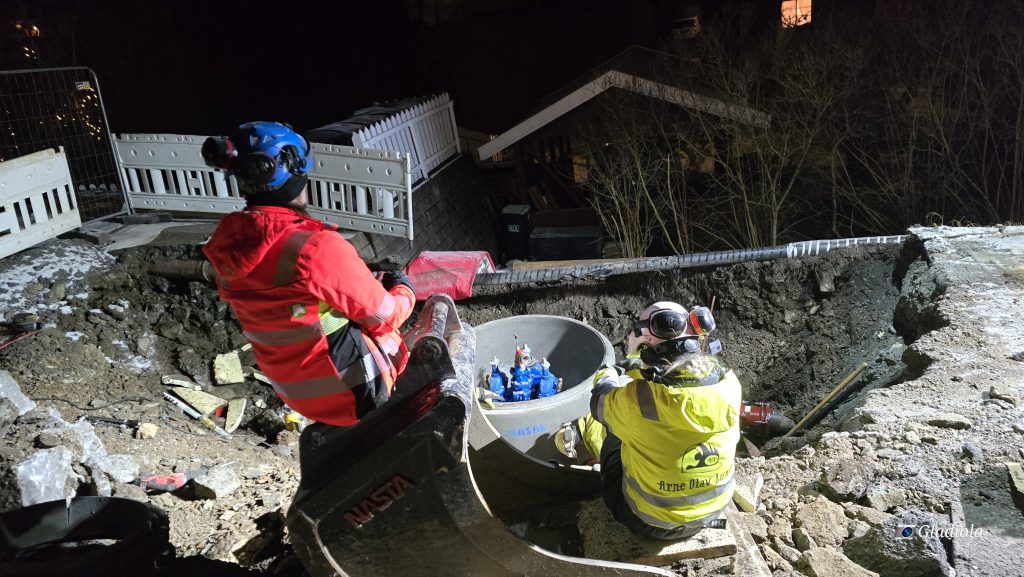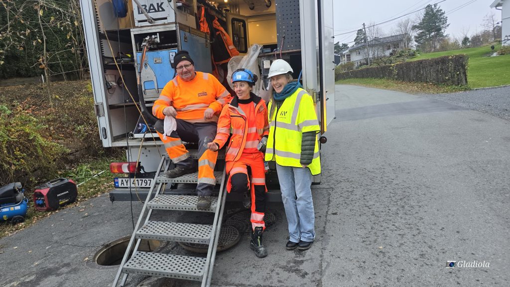 Fra prosjektet «Solhaugveien» hvor målet var å utbedre en kollapset PE-ledning i borehull i fjell. På bildet er entreprenør, representant fra ledningseier – Sylwia og rådgiver Martina Bergh Svedahl, som er VA-ingeniør i Asplan Viak og fagsekretær i RIN. Forutsetningen for at alt gikk bra, var et godt faglig samarbeid.