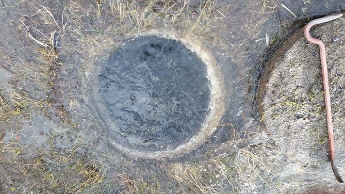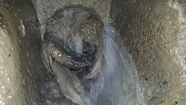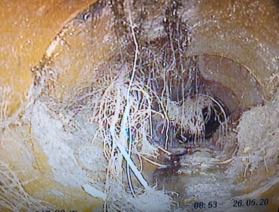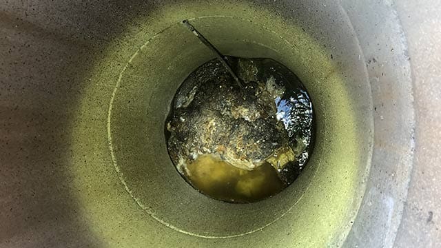 Spylekule. Fotokonkurranse 2020. Foto: Jon Kristian Alsethaug, Trondheim kommune.Privat tett gren fra stor bygård. Rørlegger var helt sikker på at han hadde spylt helt ut i kommunal ledning og hadde holdt på i 4 timer. Da var det bare å stå her å vente på at spylekula kom frem.