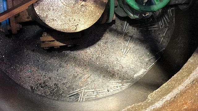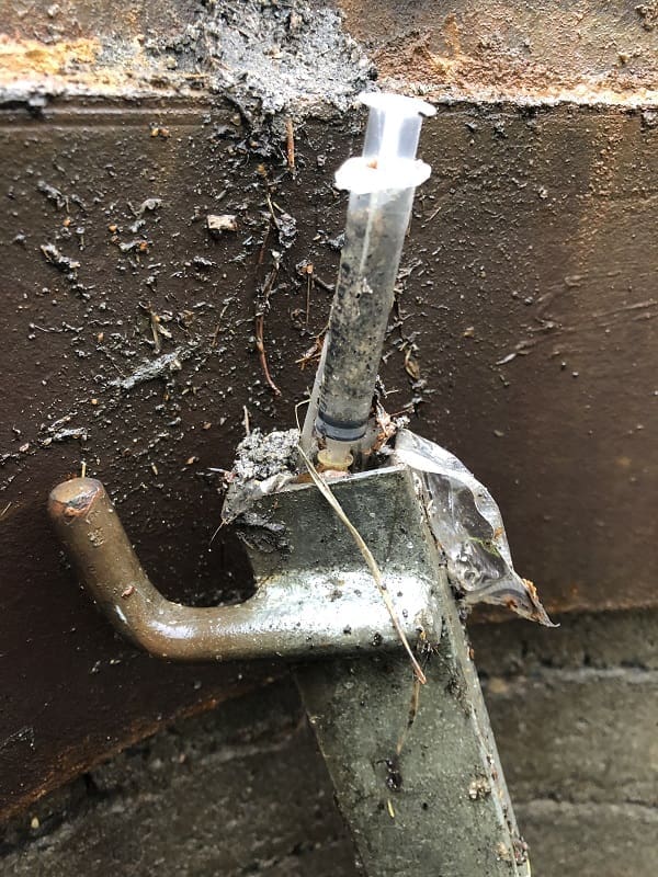 KILDESORTERING I SPETTHULLET Her har noen vært veldig miljøbevisste og kildesortert likt avfall i samme spetthull i en vannkum. Én sprøyte står fast i toppen av stigen. I bunnen av kummen ligger 30-40 sprøyter. 3 bilder i en bildeserie. Foto: Arild Kristensen, Norva24 Sørmiljø