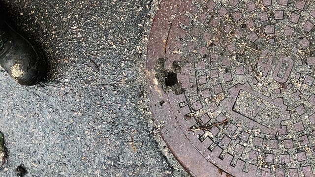 SPENNENDE SPETTHULL Spennende med spetthull. Ta et gammelt kumlokk med stort spetthull. Legg til en veipisk eller veistikke i nærheten. Bland det hele med noen nysgjerrige barn. Hva får vi da? Jo, et ganske stort problem. (Foto: Jon Kristian Alsethaug i Trondheim kommune)