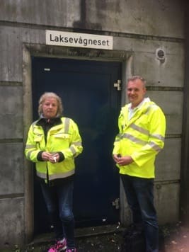 På Laksevågneset pumpestasjon har de oppnådd gode resultater ved hjelp av små, trådløse sensorer. Her er Marit Aase fra Bergen kommune og Hallvard Helgetun fra El-Watch foran pumpestasjonen på Laksevågneset.